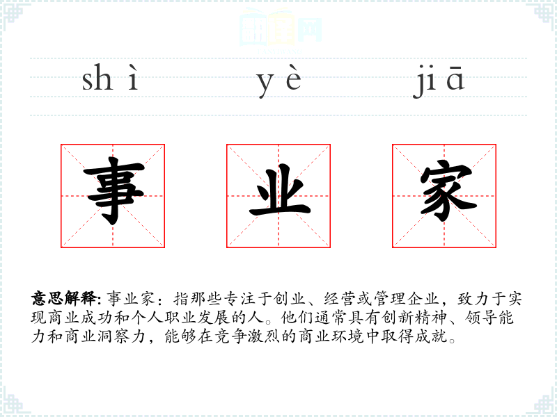 事业家:指那些专注于创业、经营或管理企业,致力于实现商业成功和个人职业发展的人。他们通常具有创新精神、领导能力和商业洞察力,能够在竞争激烈的商业环境中取得成就。