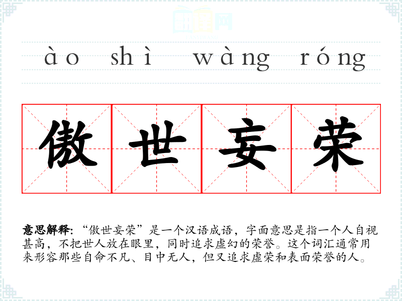 “傲世妄荣”是一个汉语成语,字面意思是指一个人自视甚高,不把世人放在眼里,同时追求虚幻的荣誉。这个词汇通常用来形容那些自命不凡、目中无人,但又追求虚荣和表面荣誉的人。