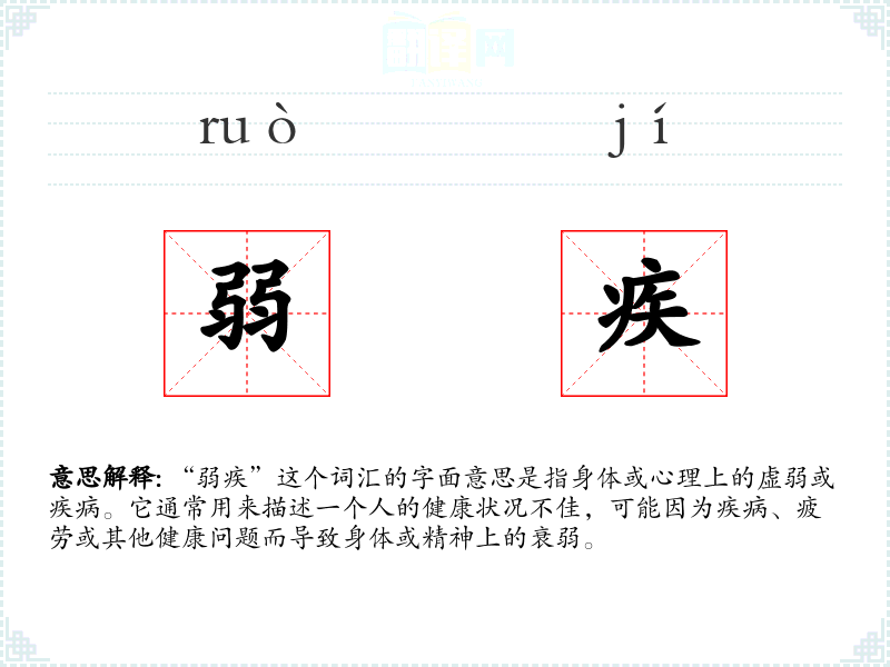 “弱疾”这个词汇的字面意思是指身体或心理上的虚弱或疾病。它通常用来描述一个人的健康状况不佳,可能因为疾病、疲劳或其他健康问题而导致身体或精神上的衰弱。