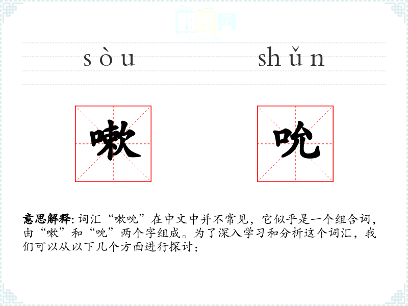 词汇“嗽吮”在中文中并不常见,它似乎是一个组合词,由“嗽”和“吮”两个字组成。为了深入学习和分析这个词汇,我们可以从以下几个方面进行探讨: