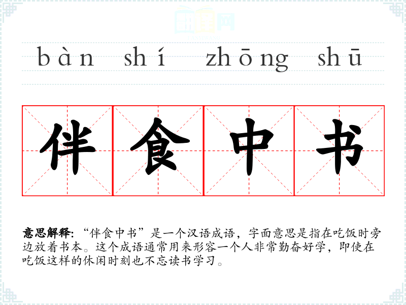 “伴食中书”是一个汉语成语,字面意思是指在吃饭时旁边放着书本。这个成语通常用来形容一个人非常勤奋好学,即使在吃饭这样的休闲时刻也不忘读书学*。