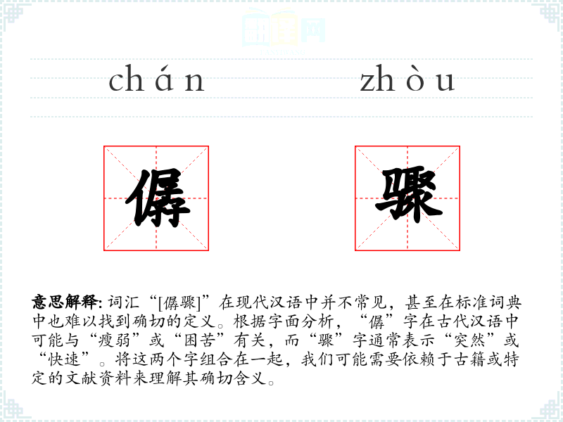 由于“僝骤”不是一个常用词汇,我们无法提供一个明确的基本定义。它可能是一个古文词汇,用于描述某种突然的、剧烈的或不寻常的状态或**。