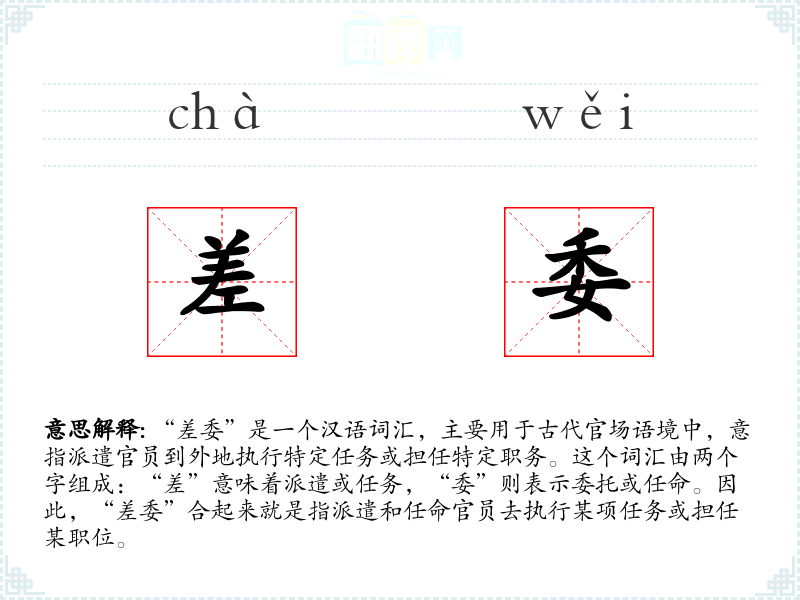 对于现代人来说,“差委”可能带有一种历史感和正式感,让人联想到古代官场的严谨和等级制度。这种词汇的使用可能会让人感到一种庄重和权威。