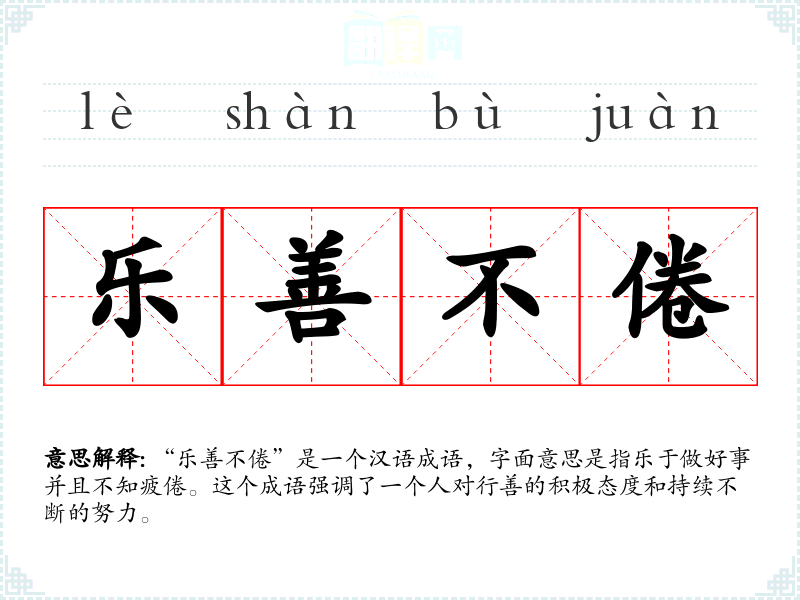 “乐善不倦”是一个汉语成语,字面意思是指乐于做好事并且不知疲倦。这个成语强调了一个人对行善的积极态度和持续不断的努力。