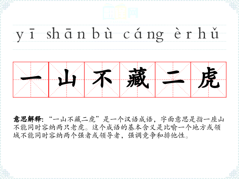 “一山不藏二虎”是一个汉语成语,字面意思是指一座山不能同时容纳两只**。这个成语的基本含义是比喻一个地方或领域不能同时容纳两个强者或领导者,强调竞争和排他性。