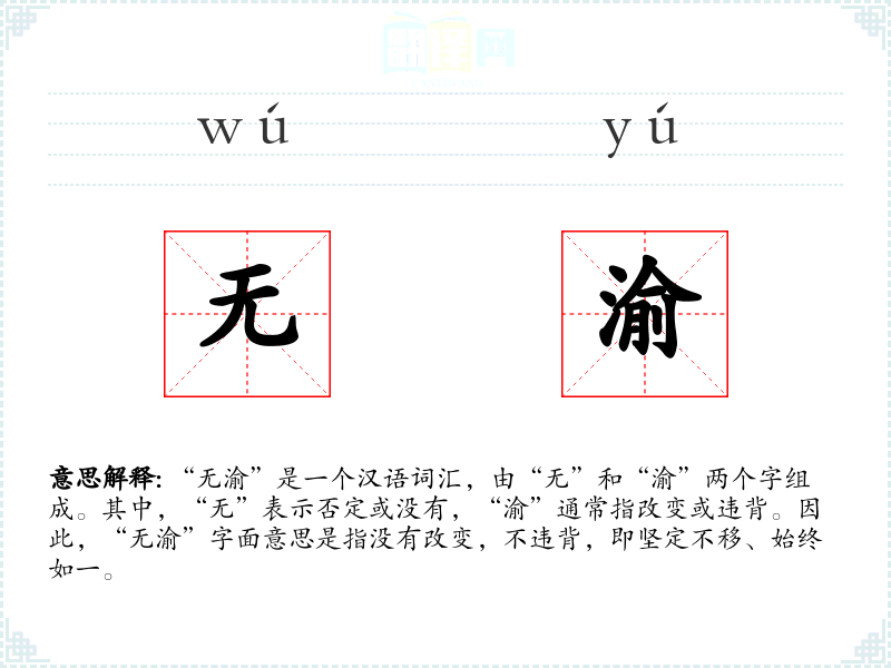 “无渝”是一个汉语词汇,由“无”和“渝”两个字组成。其中,“无”表示否定或没有,“渝”通常指改变或违背。因此,“无渝”字面意思是指没有改变,不违背,即坚定不移、始终如一。