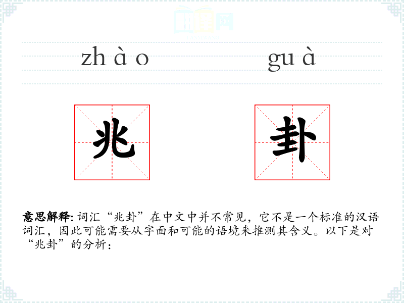 词汇“兆卦”在中文中并不常见,它不是一个标准的汉语词汇,因此可能需要从字面和可能的语境来推测其含义。以下是对“兆卦”的分析: