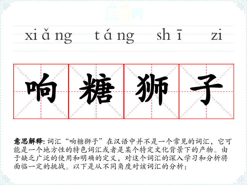 由于“响糖狮子”不是一个标准词汇,我们无法给出一个确切的字面意思和基本含义。它可能是指一种形状像狮子的糖果,且在咀嚼时会发出响声,或者是某个地区特有的手工艺品或食品。