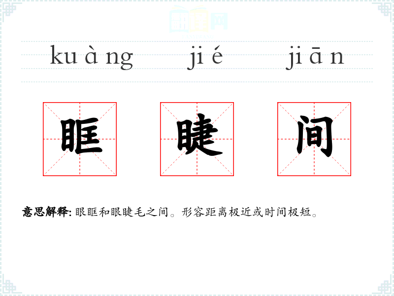 眼眶和眼睫毛之间。形容距离极近或时间极短。
