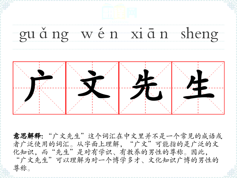 - 在古代文献中,“广文先生”常被用来尊称那些精通经史子集的学者。