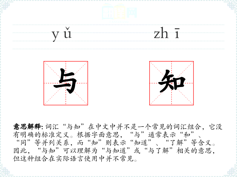 词汇“与知”在中文中并不是一个常见的词汇组合,它没有明确的标准定义。根据字面意思,“与”通常表示“和”、“同”等并列关系,而“知”则表示“知道”、“了解”等含义。因此,“与知”可以理解为“与知道”或“与了解”相关的意思,但这种组合在实际语言使用中并不常见。