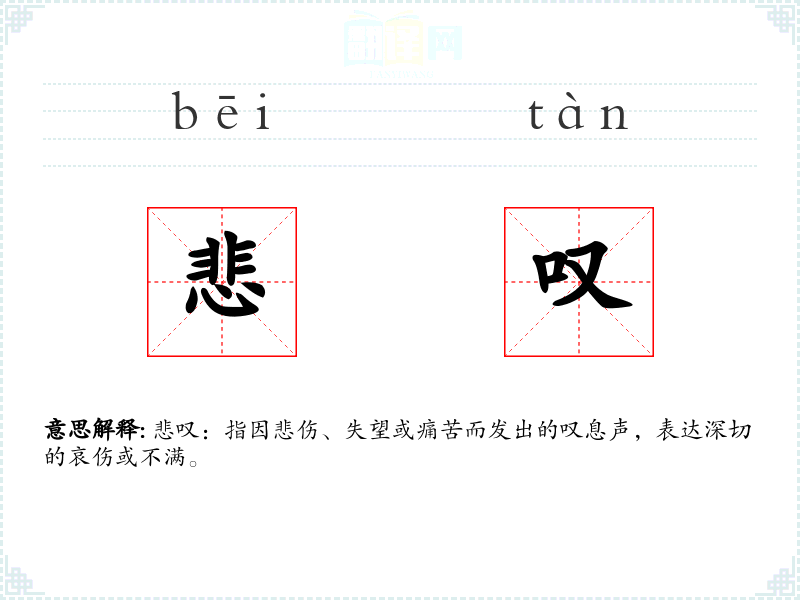 - 词源:悲叹一词源于古汉语,由“悲”和“叹”两个字组成。悲表示悲伤,叹表示叹息,两者结合形成了表达悲伤叹息的词汇。
