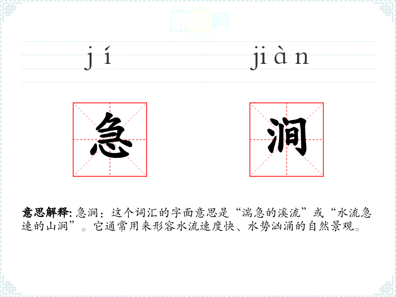 急涧:这个词汇的字面意思是“湍急的溪流”或“水流急速的山涧”。它通常用来形容水流速度快、水势汹涌的自然景观。