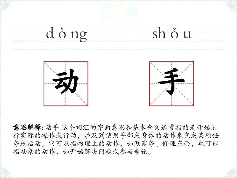 动手 这个词汇的字面意思和基本含义通常指的是开始进行实际的操作或行动,涉及到使用手部或身体的动作来完成某项任务或活动。它可以指物理上的动作,如做家务、修理东西,也可以指抽象的动作,如开始解决问题或参与争论。