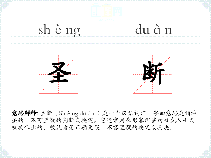 圣断(Shèng duàn)是一个汉语词汇,字面意思是指神圣的、不可置疑的判断或决定。它通常用来形容那些由权威人士或机构作出的,被认为是正确无误、不容置疑的决定或判决。