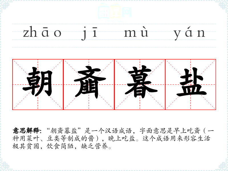 “朝齑暮盐”是一个汉语成语,字面意思是早上吃齑(一种用菜叶、豆类等制成的酱),晚上吃盐。这个成语用来形容生活极其贫困,饮食简陋,缺乏营养。