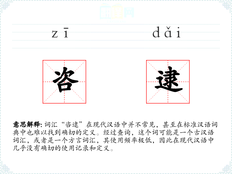 词汇“咨逮”在现代汉语中并不常见,甚至在标准汉语词典中也难以找到确切的定义。经过查询,这个词可能是一个古汉语词汇,或者是一个方言词汇,其使用频率极低,因此在现代汉语中几乎没有确切的使用记录和定义。