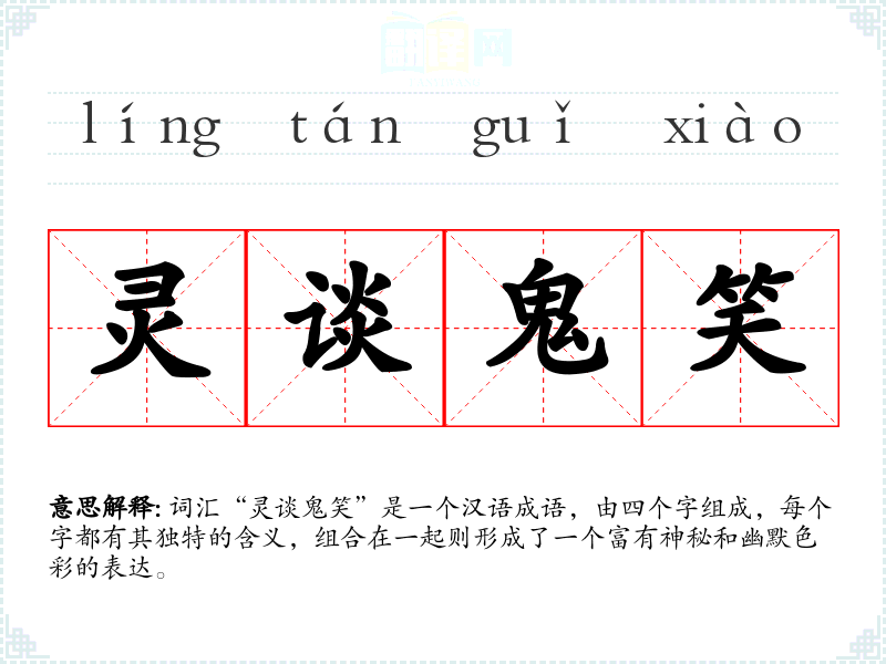 词汇“灵谈鬼笑”是一个汉语成语,由四个字组成,每个字都有其独特的含义,组合在一起则形成了一个富有神秘和幽默色彩的表达。