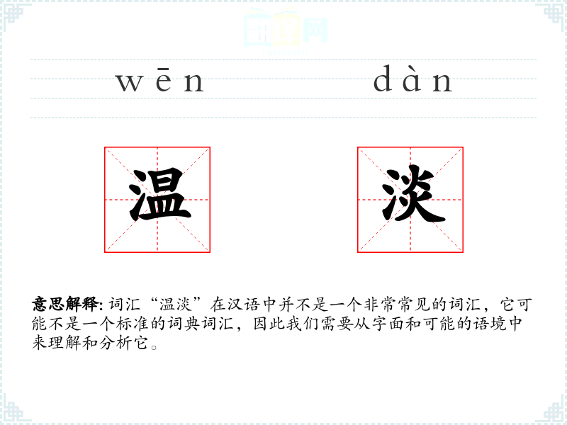 词汇“温淡”在汉语中并不是一个非常常见的词汇,它可能不是一个标准的词典词汇,因此我们需要从字面和可能的语境中来理解和分析它。