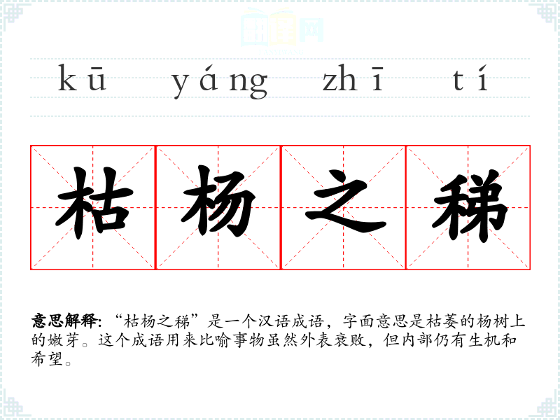“枯杨之稊”是一个汉语成语,字面意思是枯萎的杨树上的嫩芽。这个成语用来比喻事物虽然外表衰败,但内部仍有生机和希望。
