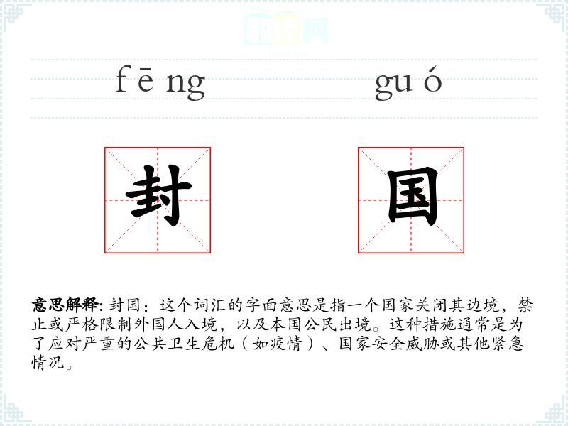 封国:这个词汇的字面意思是指一个国家关闭其边境,禁止或严格限制外国人入境,以及本国公民出境。这种措施通常是为了应对严重的公共卫生危机(如疫情)、国家安全威胁或其他紧急情况。