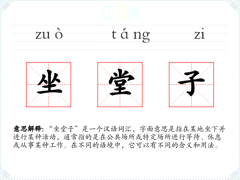 - 口语语境:在日常口语中,人们可能会用“坐堂子”来指代在某个地方坐着等待,如“我在咖啡馆坐堂子等朋友”。