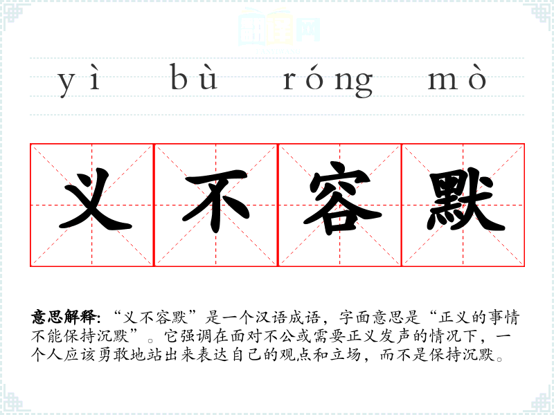 “义不容默”是一个汉语成语,字面意思是“正义的事情不能保持沉默”。它强调在面对不公或需要正义发声的情况下,一个人应该勇敢地站出来表达自己的观点和立场,而不是保持沉默。