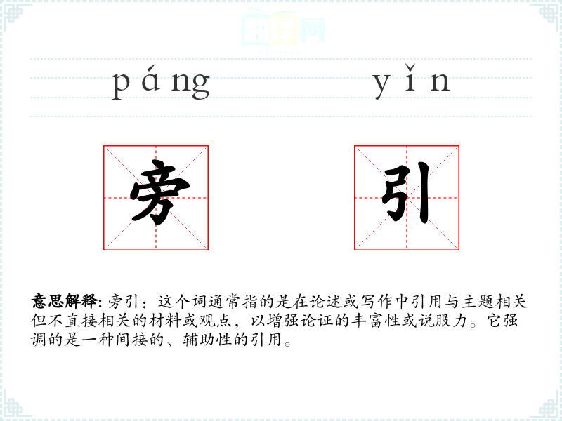 旁引:这个词通常指的是在论述或写作中引用与主题相关但不直接相关的材料或观点,以增强论证的丰富性或说服力。它强调的是一种间接的、辅助性的引用。