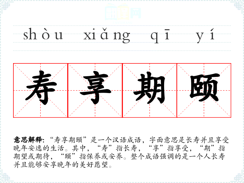 “寿享期颐”是一个汉语成语,字面意思是长寿并且享受晚年安逸的生活。其中,“寿”指长寿,“享”指享受,“期”指期望或期待,“颐”指保养或安养。整个成语强调的是一个人长寿并且能够安享晚年的美好愿望。