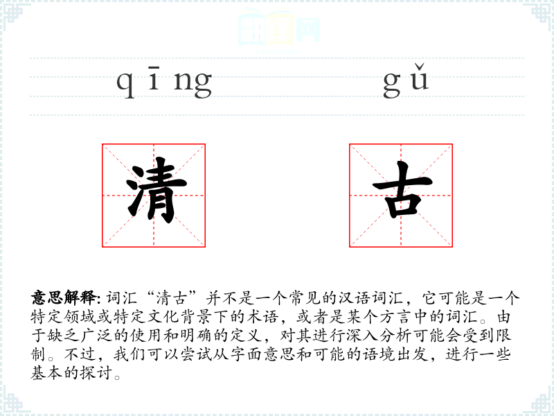 尽管“清古”不是一个常见的词汇,通过对它的基本分析,我们可以理解它可能用来形容一种既古老又清新的风格或感觉。在语言学习和表达中,了解和掌握这样的词汇可以帮助我们更准确地表达特定的情感和审美。