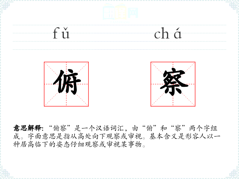 “俯察”这个词在汉语中具有丰富的文化内涵和使用场景,它不仅描述了一种物理行为,还隐含了权威和智慧的象征。在学*语言和表达时,理解这样的词汇可以帮助我们更准确地传达复杂的情感和意图。