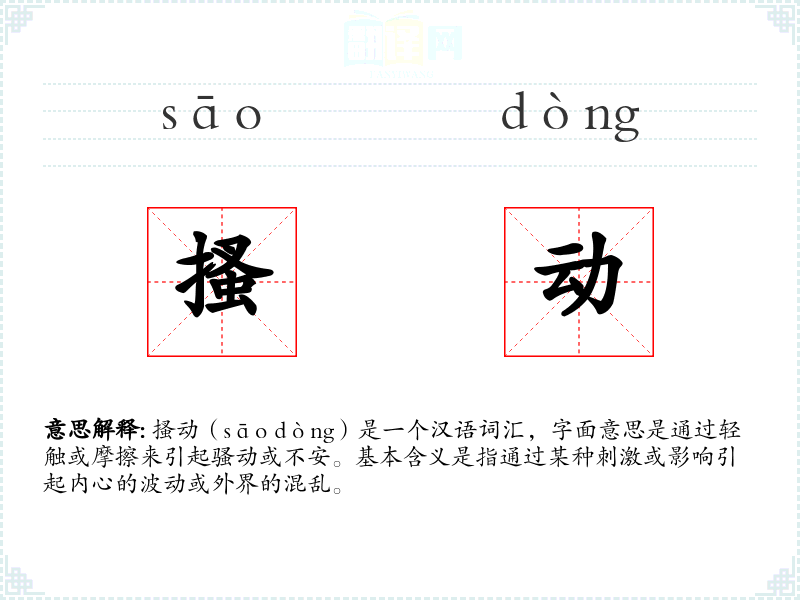搔动(sāo dòng)是一个汉语词汇,字面意思是通过轻触或摩擦来引起骚动或不安。基本含义是指通过某种刺激或影响引起内心的波动或外界的混乱。