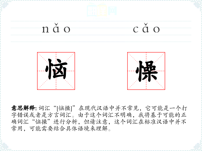 词汇“[恼操]”在现代汉语中并不常见,它可能是一个打字错误或者是方言词汇。由于这个词汇不明确,我将基于可能的正确词汇“恼操”进行分析,但请注意,这个词汇在标准汉语中并不常用,可能需要结合具体语境来理解。
