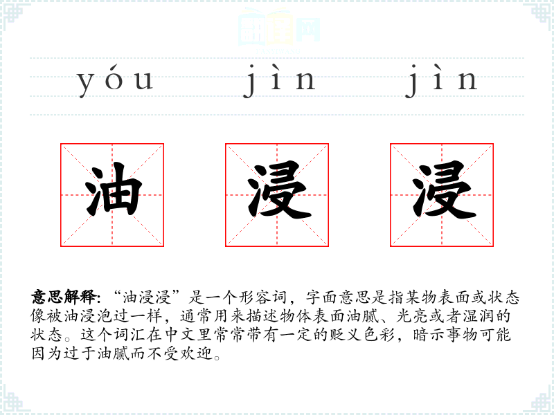 “油浸浸”是一个形容词,字面意思是指某物表面或状态像被油浸泡过一样,通常用来描述物体表面油腻、光亮或者湿润的状态。这个词汇在中文里常常带有一定的贬义色彩,暗示事物可能因为过于油腻而不受欢迎。