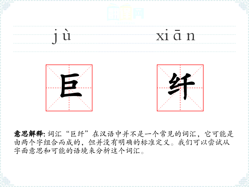 词汇“巨纤”在汉语中并不是一个常见的词汇,它可能是由两个字组合而成的,但并没有明确的标准定义。我们可以尝试从字面意思和可能的语境来分析这个词汇。