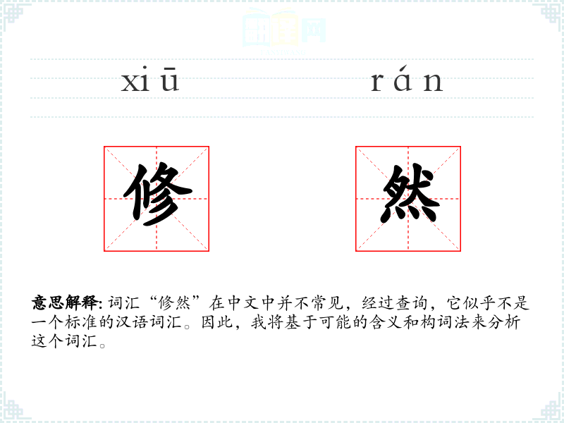 词汇“修然”在中文中并不常见,经过查询,它似乎不是一个标准的汉语词汇。因此,我将基于可能的含义和构词法来分析这个词汇。