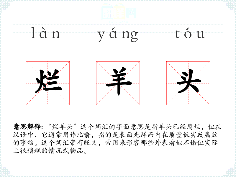“烂羊头”这个词汇的字面意思是指羊头已经腐烂,但在汉语中,它通常用作比喻,指的是表面光鲜而内在质量低劣或腐败的事物。这个词汇带有贬义,常用来形容那些外表看似不错但实际上很糟糕的情况或物品。