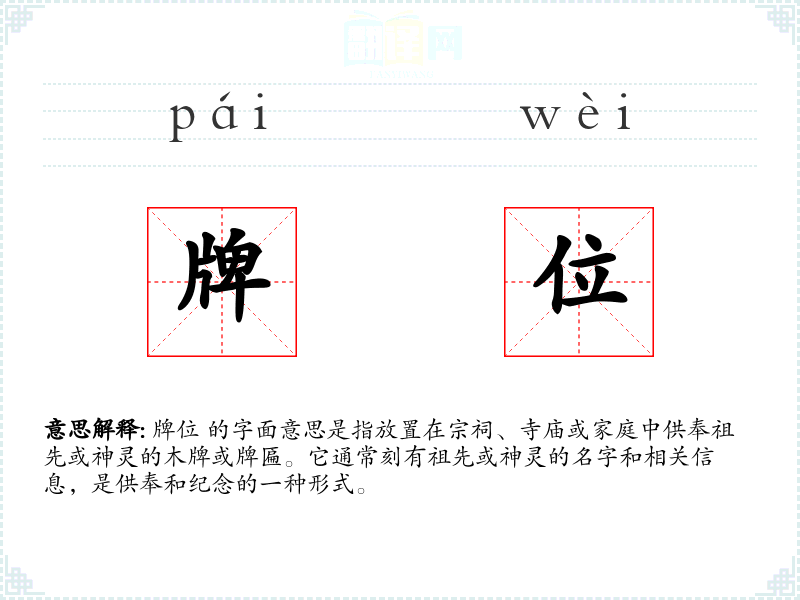 - 反义词:无(牌位本身是一个特定的文化概念,没有直接的反义词)