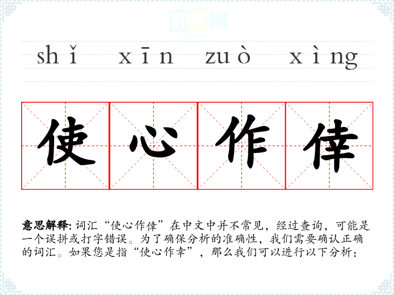 词汇“使心作倖”在中文中并不常见,经过查询,可能是一个误拼或打字错误。为了确保分析的准确性,我们需要确认正确的词汇。如果您是指“使心作幸”,那么我们可以进行以下分析: