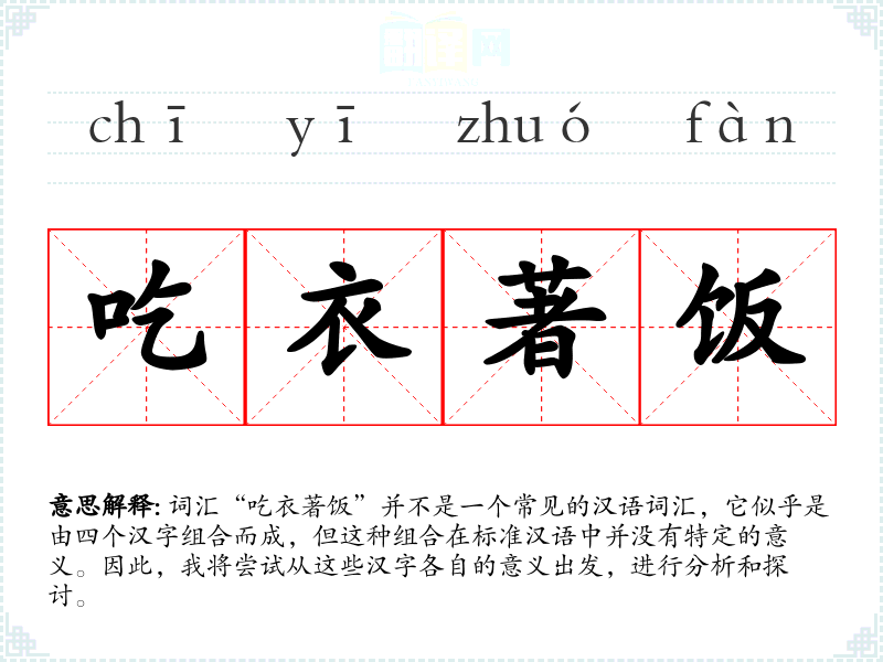 词汇“吃衣著饭”并不是一个常见的汉语词汇,它似乎是由四个汉字组合而成,但这种组合在标准汉语中并没有特定的意义。因此,我将尝试从这些汉字各自的意义出发,进行分析和探讨。