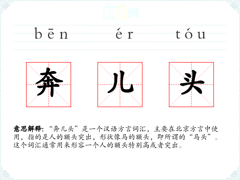 “奔儿头”是一个汉语方言词汇,主要在北京方言中使用,指的是人的额头突出,形状像马的额头,即所谓的“马头”。这个词汇通常用来形容一个人的额头特别高或者突出。