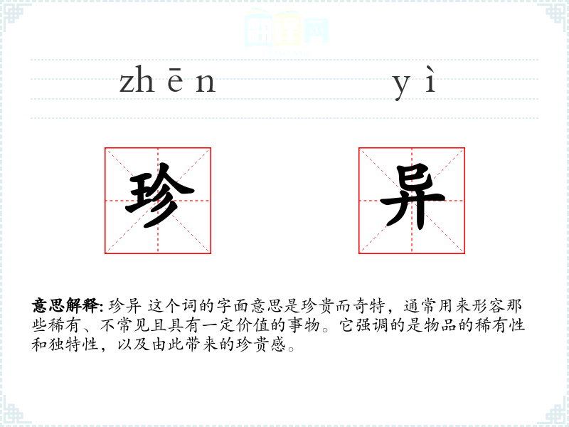 珍异 这个词的字面意思是珍贵而奇特,通常用来形容那些稀有、不常见且具有一定价值的事物。它强调的是物品的稀有性和独特性,以及由此带来的珍贵感。