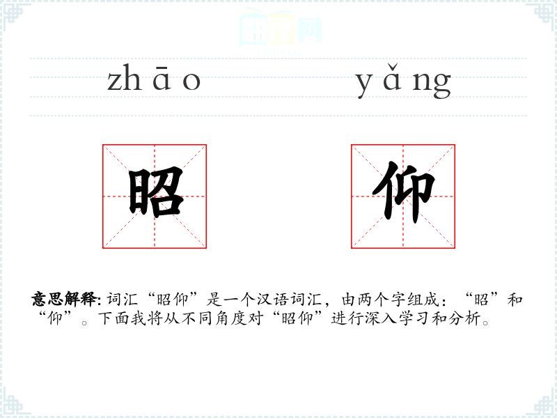 - 词源:“昭”和“仰”都是古代汉语中的常用字,组合起来形成“昭仰”这个词汇,历史悠久。