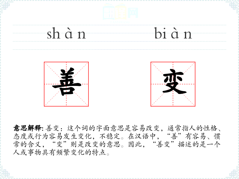 善变:这个词的字面意思是容易改变,通常指人的性格、态度或行为容易发生变化,不稳定。在汉语中,“善”有容易、惯常的含义,“变”则是改变的意思。因此,“善变”描述的是一个人或事物具有频繁变化的特点。
