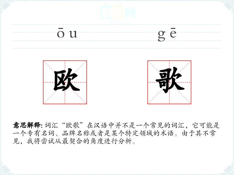 词汇“欧歌”在汉语中并不是一个常见的词汇,它可能是一个专有名词、品牌名称或者是某个特定领域的术语。由于其不常见,我将尝试从最契合的角度进行分析。