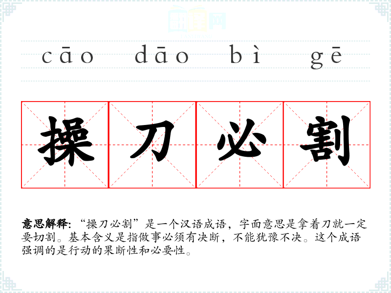 “操刀必割”是一个汉语成语,字面意思是拿着刀就一定要切割。基本含义是指做事必须有决断,不能犹豫不决。这个成语强调的是行动的果断性和必要性。