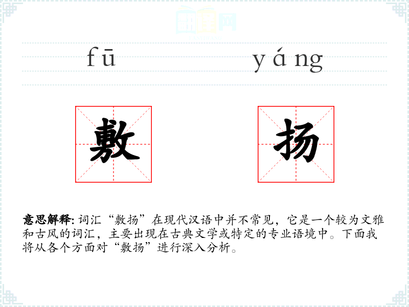 词汇“敷扬”在现代汉语中并不常见,它是一个较为文雅和古风的词汇,主要出现在古典文学或特定的专业语境中。下面我将从各个方面对“敷扬”进行深入分析。