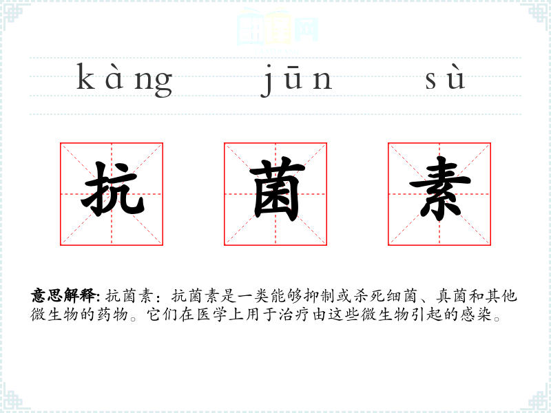 - 反义词:无(抗菌素没有直接的反义词,但可以说“促进微生物生长”的物质)