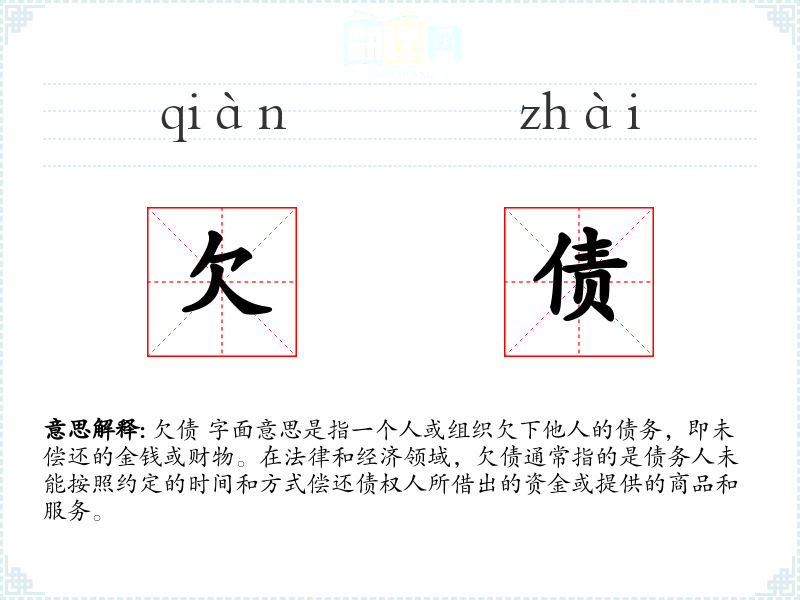 欠债 字面意思是指一个人或组织欠下他人的债务,即未偿还的金钱或财物。在法律和经济领域,欠债通常指的是债务人未能按照约定的时间和方式偿还债权人所借出的资金或提供的商品和服务。