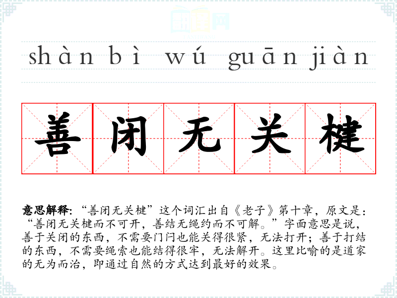 “善闭无关楗”这个词汇出自《老子》第十章,原文是:“善闭无关楗而不可开,善结无绳约而不可解。”字面意思是说,善于关闭的东西,不需要门闩也能关得很紧,无法打开;善于打结的东西,不需要绳索也能结得很牢,无法解开。这里比喻的是道家的无为而治,即通过自然的方式达到最好的效果。